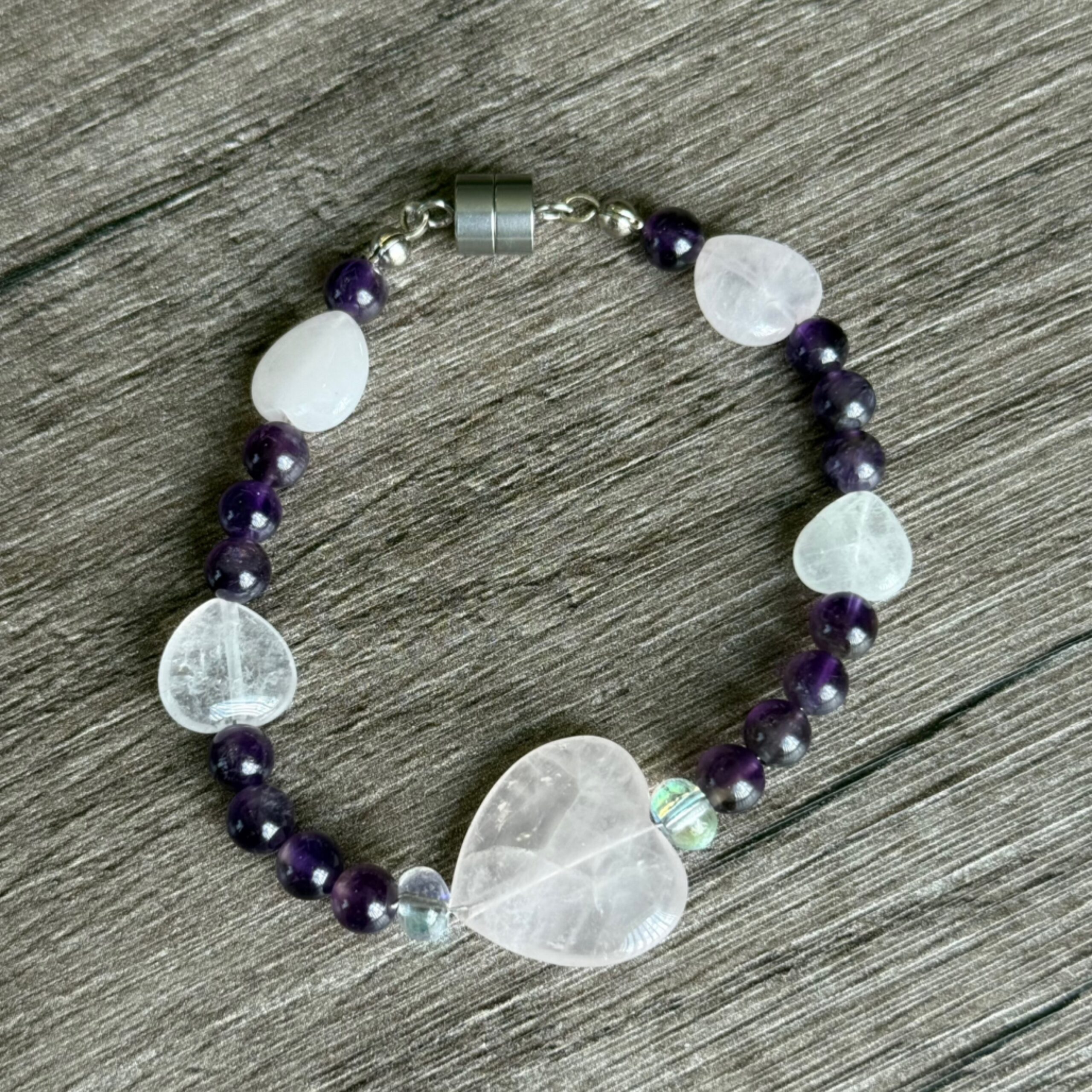 This bracelet showcases five heart-shaped gemstones crafted from natural Rose Quartz and Amethyst, known for their association with emotional healing and balance. The combination of these gemstones creates a harmonious and elegant accessory, with each piece highlighting its unique natural variations. Designed for both style and wellness, this bracelet is ideal for those who appreciate the beauty and energy of healing crystals.